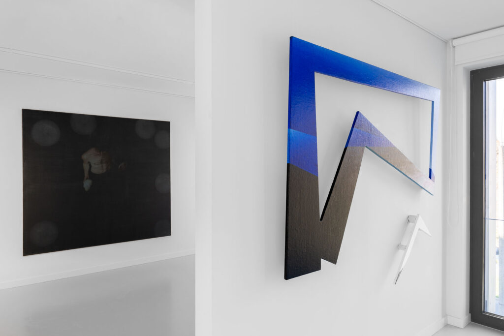 W drugiej pracy, według mnie, pustka nie jest częścią obrazu, a raczej czymś ograniczającym płaszczyznę płótna – to ona nadaje obrazowi ostateczny kształt. Praca ta składa się z dwóch płócien, które uwikłane są w relacje dyktowane przez ich układ. Cienie pojawiające się dzięki niewypełnionej przestrzeni w środku kompozycji dodają obrazowi teatralności i tworzą idealne tło dla interakcji między elementami. Patrząc na obraz, czułam sprzeczne emocje. Z jednej strony połączenie kolorów – niebieskiego, czarnego i białego – oraz kształtów przywoływało na myśl morski pejzaż i dawało poczucie spokoju. Z drugiej strony pojawiło się tutaj pewne, przykuwające wzrok napięcie.