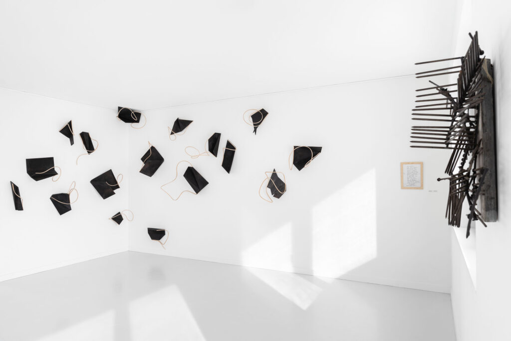 Pracą, która w najbardziej oczywisty sposób łączy się wizualnie z realizacjami pozostałych artystów biorących udział w wystawie nosi tytuł Horyzont (2024-2026). Kompozycja składa się z przestrzennych obiektów, które przybierają formę powyginanych geometrycznych kształtów. Do każdego z nich dołączona została organiczna linia, stworzona z podobnego materiału, ale bardziej swobodna. Moją uwagę przykuło połączenie dwóch rodzajów sklejki i wykorzystanie ich w zupełnie odmienny sposób. Ten kontrast potęguje dynamizm całej pracy, która mocno oddziałuje na przestrzeń, tworząc napięcia między pokazywanymi obiektami ułożonymi w wielkoformatowy zbiór.