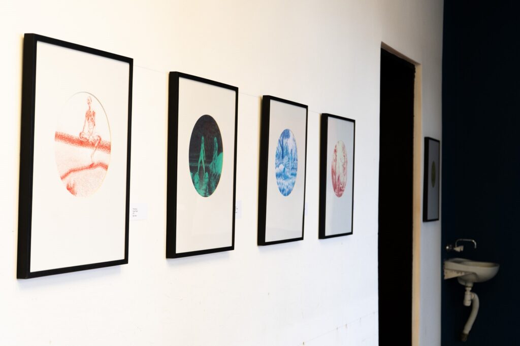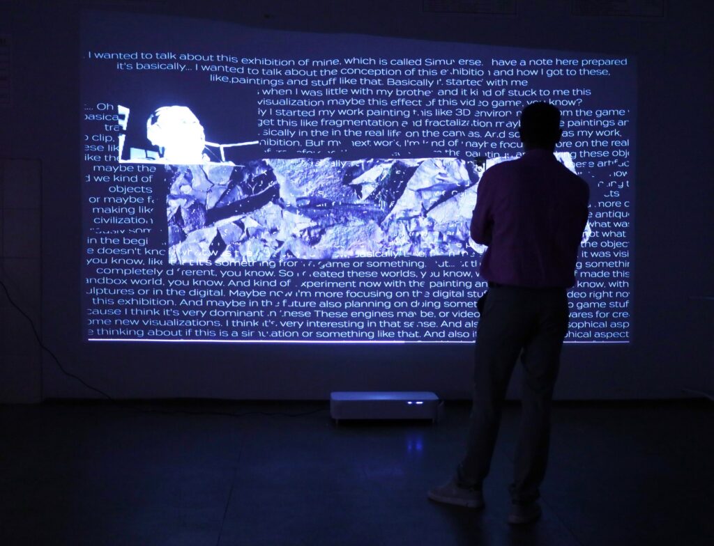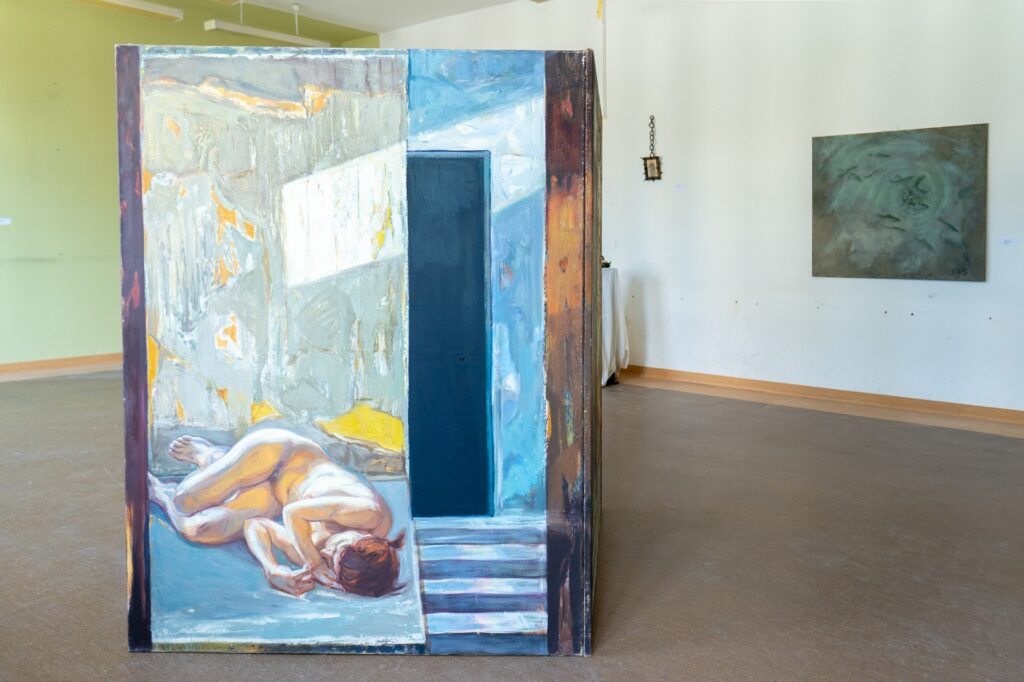Generowanie nowych światów przybiera również formy bardziej liryczne, wynikające z wyobraźni, emocji twórczyń. Katarzyna Knychała powołała do życia stworzenia, które obserwuje wraz z rozwijającą się serią obrazów. Proces malarski jest jednocześnie procesem rozwoju tych istnień. Mają pozbawione szczegółów ciała podobne trochę do psa, jednak wykazują wyższą formę organizacji i grupowego porozumienia, eksplorują przestrzeń. Dość pokrewne są też obrazy Julii Królikowskiej. Jej twory bardziej przypominają kości, ścięgna, mięśnie. Sprawiają wrażenie wykwitów sztucznej inteligencji, jednocześnie spełniając funkcje czysto malarskie – „napinając” kompozycję na półprzezroczystych płaszczyznach, ujawniających konstrukcję blejtramu pod spodem. Denys Kulikov pokazuje całą serię kolczastych stworów, demonów, przybierających estetyczną formę ceramicznego popiersia, rozsuwanego tryptyku bądź obrazu, którego rama jest równie nastroszona kolcami, jak treść rysunku.