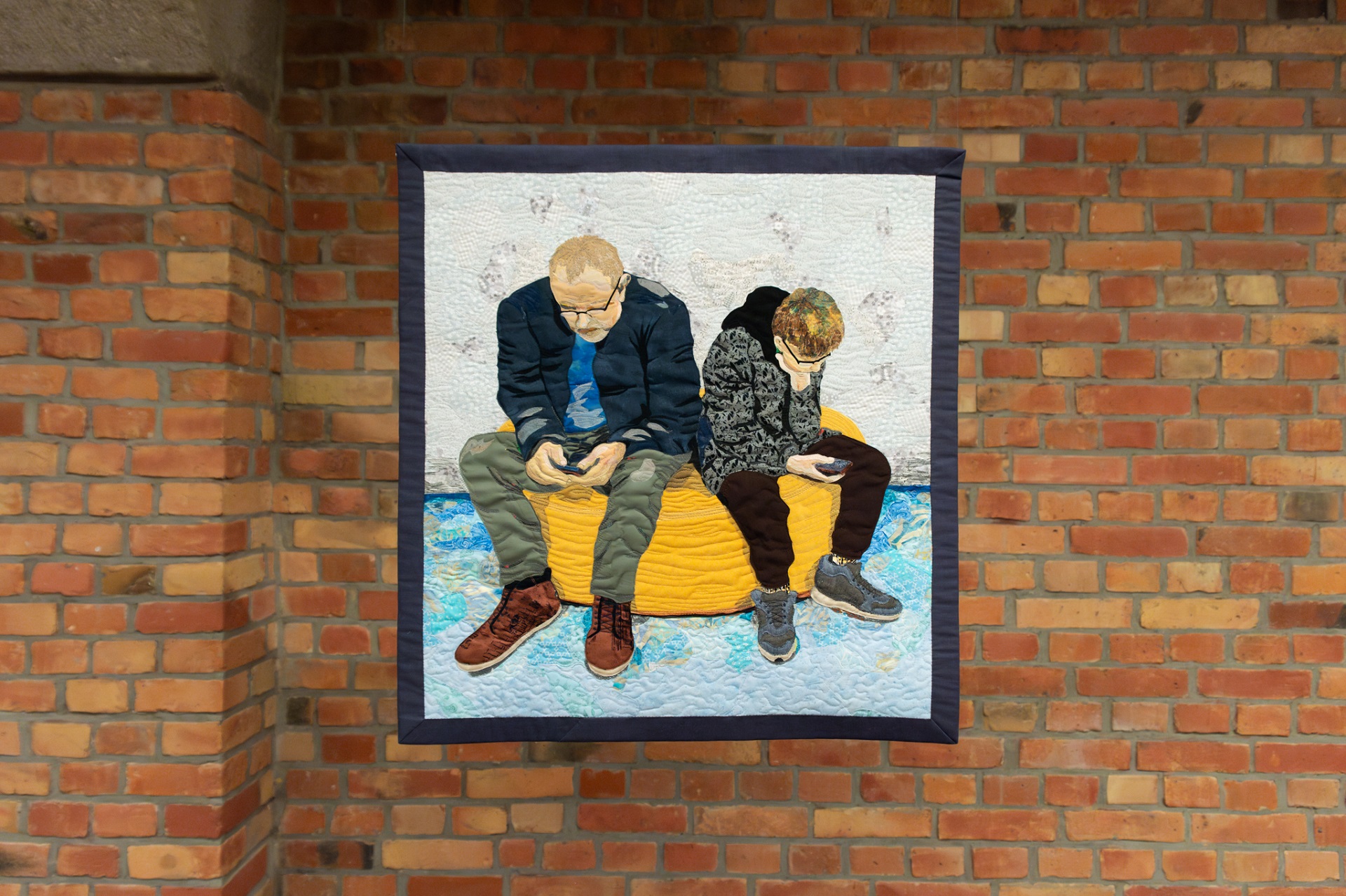Drugą stronę medalu – ów „brak splotu”, który tworzyłby relację, przedstawia wykonana w technice batiku praca Danuty Owczarek „Komentarz społeczny”. Widzimy na niej dziadka i wnuka, odwróconych od siebie i zapatrzonych w ekrany telefonów – obrazek znany nam z codzienności aż nadto dobrze. Ciekawe jest zderzenie „miękkości” techniki z chłodem bijącym z zerwanej relacji między przedstawionymi osobami. Inspirujący wydaje się tytuł pracy: komentarz umieszczany w internecie daleki jest od nawiązywania (znowu ten splot w słowie) prawdziwych relacji. A widoczność w sieci – z faktycznym dostrzeganiem drugiego człowieka.